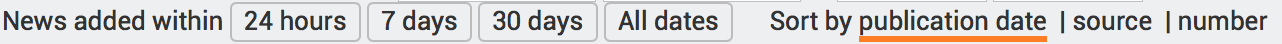 The fourth supplements the made selection with the additional sorting parameters. The readerк can select only the latest news that appeared in our database for the past 24 hours, 7 or 30 days, as well as to sort news items by the publication date (the latest news according to the publication media release is given above); the sources by alphabetical order for a day, as well as by the number (polpred id) — the recently added to the database texts are displayed above.