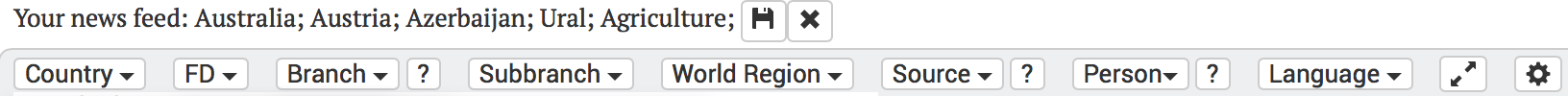 The rubricator with settings for work with the array of full-text business articles. Separate fields include: search area / industry sector / source / date / country / RF federal district / world region / main / personalities / personal lists / mark / favorites. For a detailed study of the rubcitaor you should head over to the Tour page.